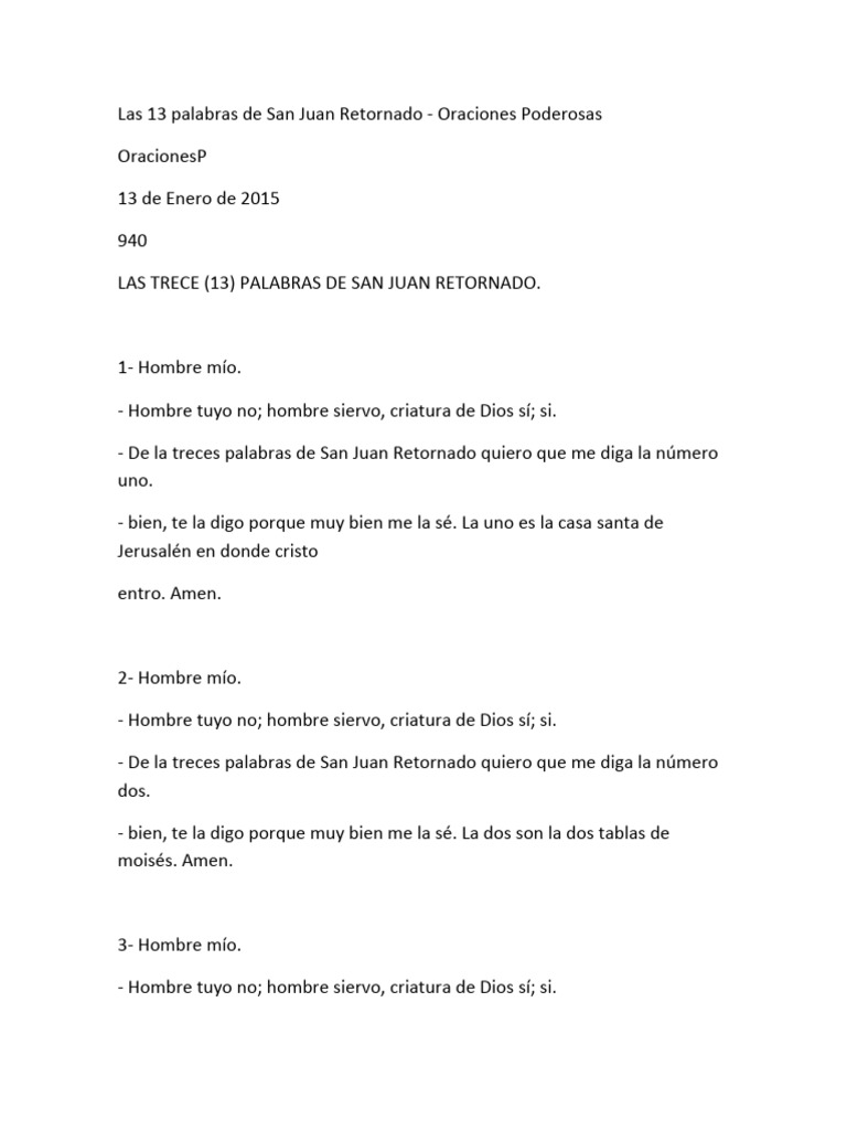 13 Palabras De San Juan Retornado - Si de la trece palabras de san juan retornado quiero que me diga la número. Una oración antigua que se atribuye a juan retornado, un santo misterioso que supuestamente reveló las 13 palabras de cristo. Hombre mío, hombre tuyo no, hombre siervo, criatura de dios sí; Descubre el misticismo en 'las 13 palabras de san juan retornado'. Profundiza en la fe y la espiritualidad con nuestras reflexiones.