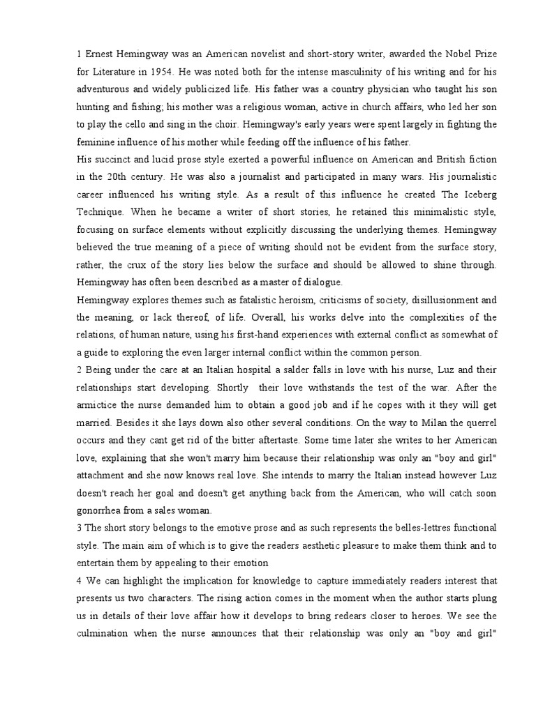 A summary of a very short story in ernest hemingway's in our time. A short time after he contracted gonorrhea from a sales girl in a loop department store while riding in a taxicab through lincoln. A very short story (english) one hot evening in padua they carried him up onto the roof and he could look out over the.