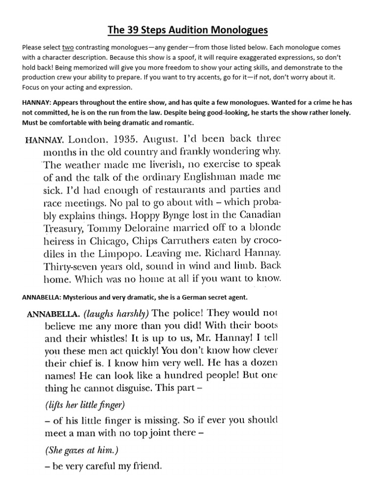 All pieces are roughly 1 and ½ to 2 minutes in length, so you need not. Choosing your monologue is an important part of the audition preparation. Please select one of the following monologues to prepare for your audition. Please select one of the following monologues to prepare for your audition.