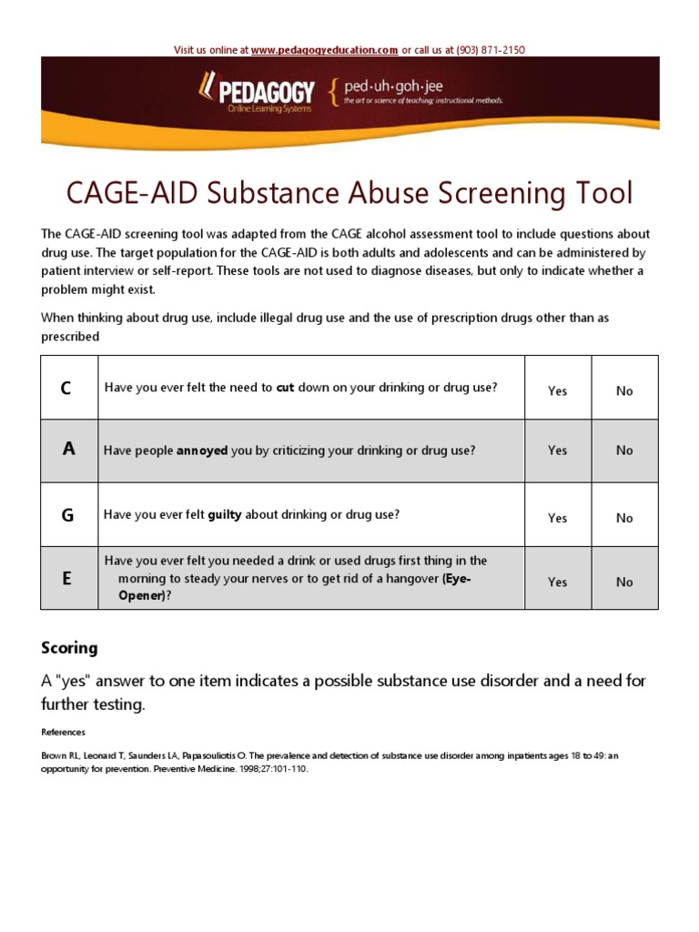 Cage questionnaire • have you ever felt you should cut down on your drinking? It takes less then 1 minute to administer, is easy to learn,. • have people annoyed you by criticizing your drinking? Ask your patients these four questions and use the scoring method described below to determine if. Cage substance abuse screening tool directions: