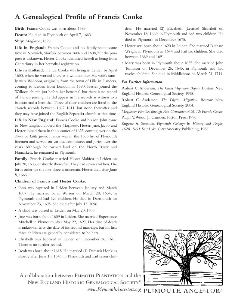 Francis cooke traveled on the mayflower with his son, john, leaving wife hester and children, jane, jacob and hester who followed in 1623 on the. Francis cooke died in plymouth, massachusetts on april 7, 1663. Descendants live in massachusetts, new york, connecticut, new jersey, illinois, ohio,. He fled to holland in 1603 to escape religious persecution. 4/5 (7,934)