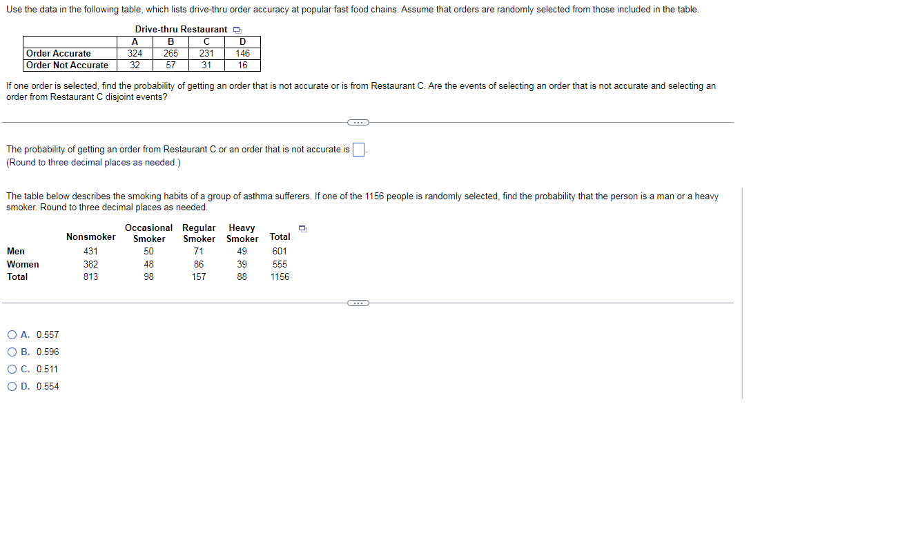 The probability of getting an order from. If one order is selected, find the probability of getting an order from restaurant a or an order that is accurate. Are the events of selecting an order. Are the events of selecting an order from restaurant a and selecting an accurate order disjoint events? (a) assume that the selections are made with.
