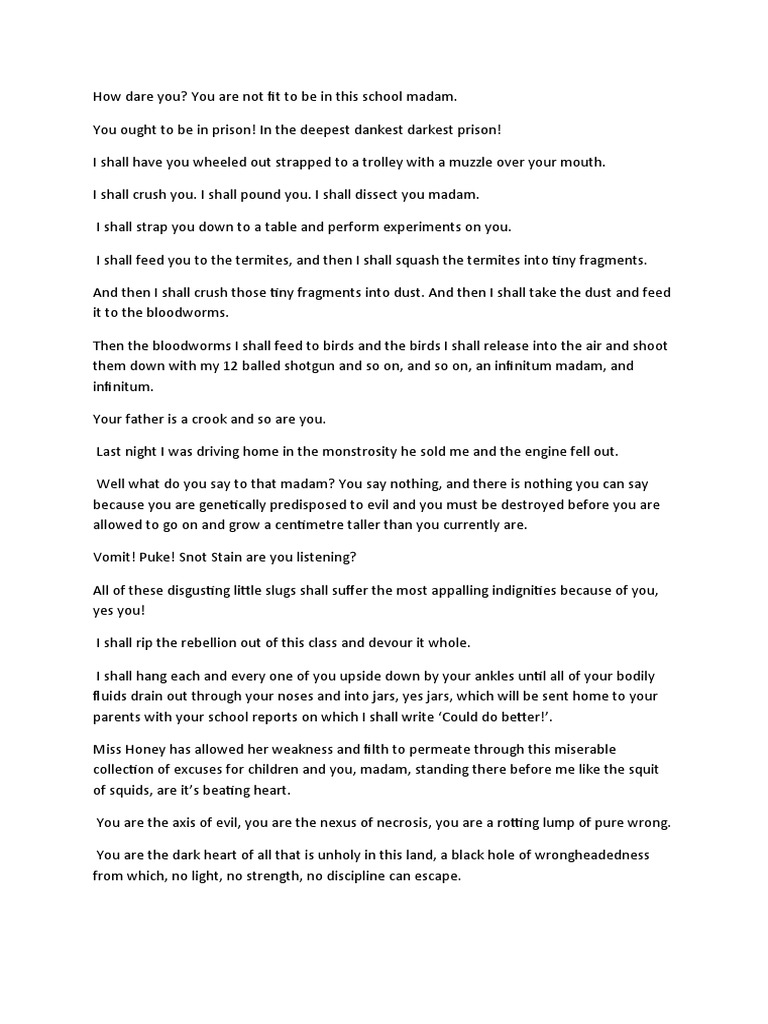 Sometimes in life, horrible and unexplainable things happen. Here in the library again, are we? Welcome to opening monologue, your ultimate source for matilda monologues! We've gathered the most popular. These things are a test of character. Performers are asked to prepare the monologue for whom they are auditioning. Your parents must be so proud to have a girl as clever as you. What a pleasure to see you;