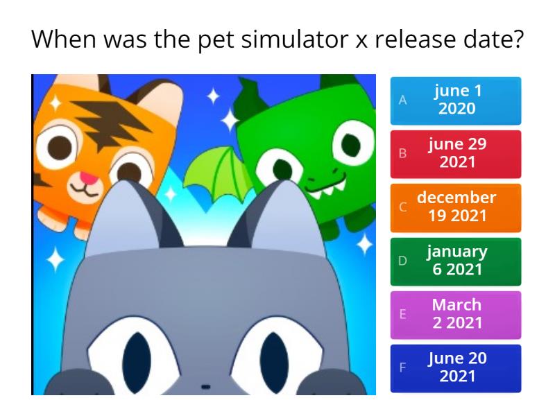 Can you name the pet simulator x pets? Test your knowledge on this gaming quiz and compare your score to others. Find other quizzes for fun and more on quizizz for free! 1) when was pet simulator x made a) july 29th 2021 b) october 27th 2020 c) july 31st 2020 d) 12th february 2023 2) what is this huge?.