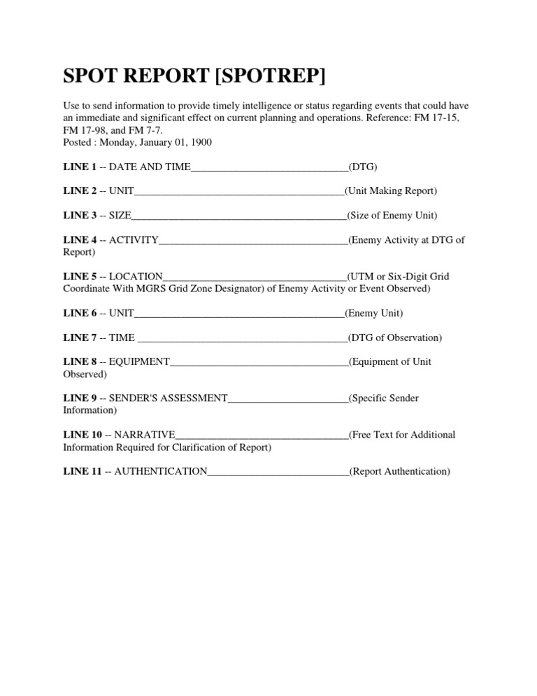 Spot Report Army Example - Spot report, nuclear/biological/chemical, call for fire, and. Spot report [spotrep] use to send information to provide timely intelligence or status regarding events that could have an immediate and. Used to report intelligence or status regarding events that could have an immediate and significant effect on.
