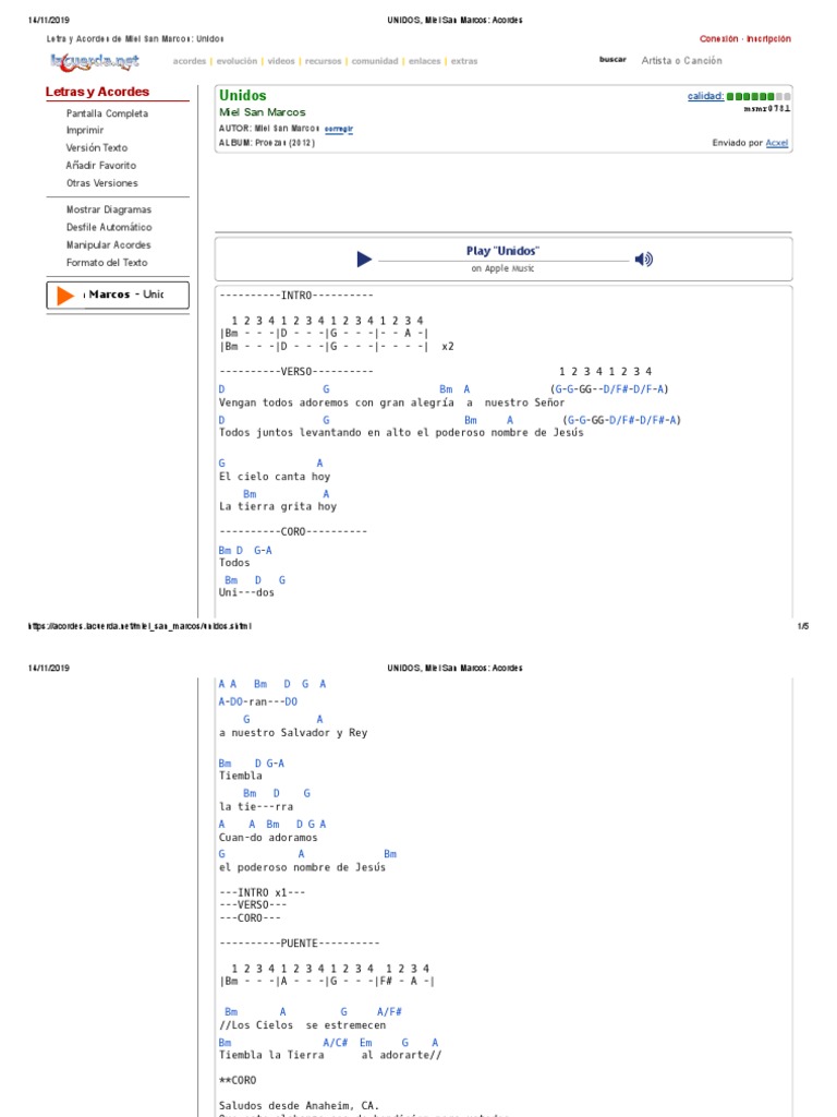 Letra y acordes de guitarra. Acordes, letra y tablatura de la canción unidos de miel san marcos (miel san marcos unidos ). How to play unidos font −1 +1. ¿cómo tocar unidos en la guitarra?. Aprende a tocar esta canción. Cómo tocar la canción unidos de miel san marcos; Acordes de unidos, miel san marcos: Unidos miel san marcos© proezas (2012) tutoriales: Te agradezco por tu amor; 717 vistas, añadido a favoritos 95 veces.