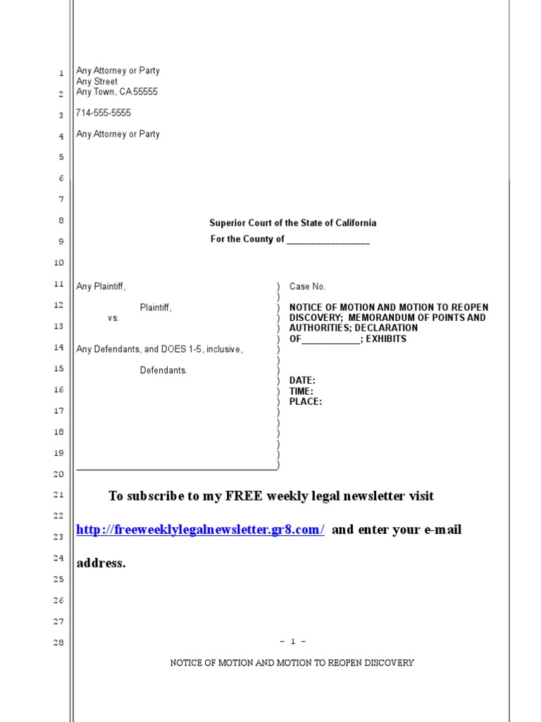 Sample Motion to Reopen Discovery in California Discovery (Law