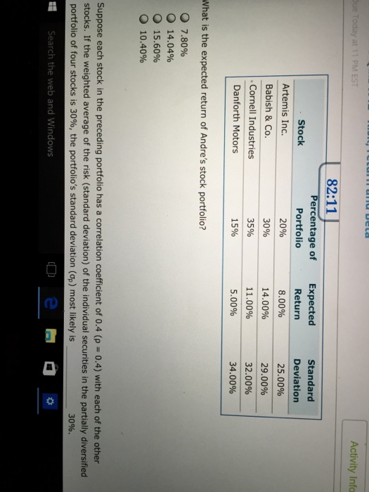 Suppose each stock in andre’s portfolio has a correlation coefficient of 0.4 (ρ = 0.4) with. Analyzing portfolio risk and return involves the understanding of expected returns from a portfolio. If the weighted average of the risk of the individual securities (as measured by their standard deviations) included in the partially diversified. What is the expected return on andre’s stock.