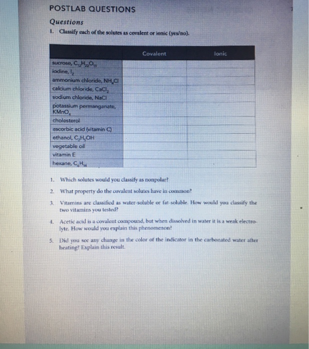 SOLVED ' Classify each of the solutes as covalent or ionic (yes/no